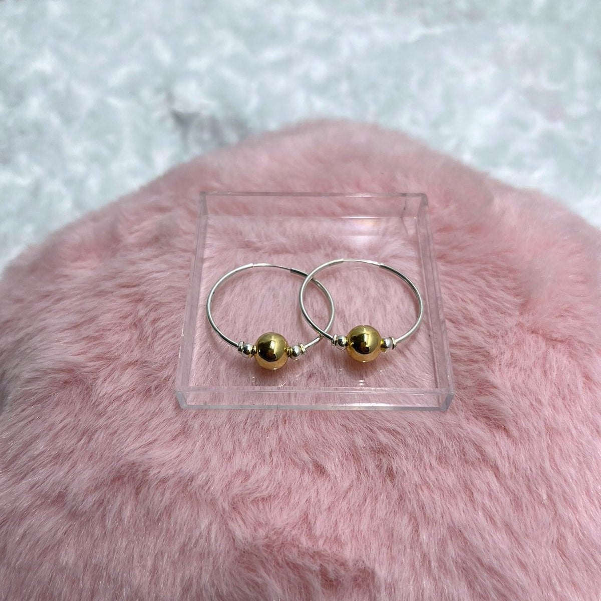Candonga de plata ley 925 con balines plateados y dorados, estilo liso. Plata de excelente calidad, garantizada.